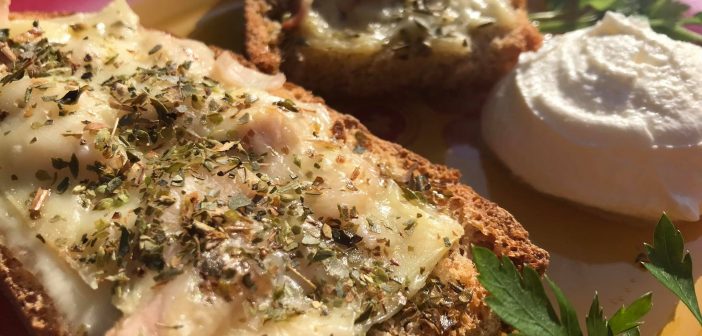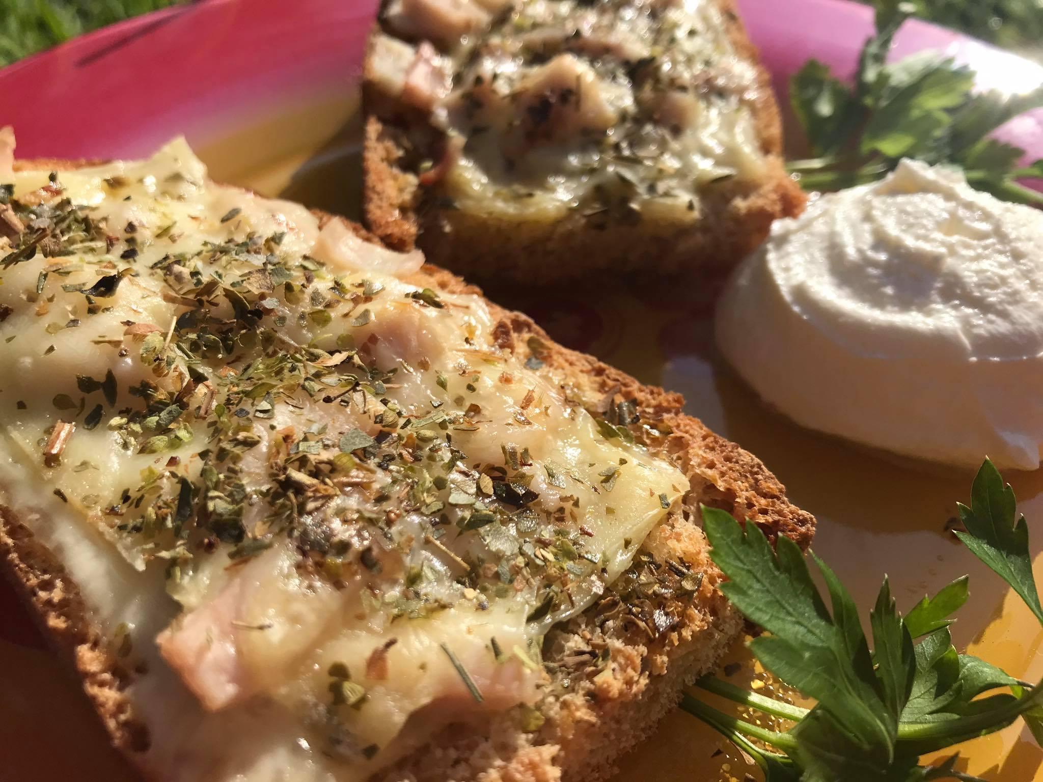 Poređati kriške hljeba na papir za pečenje, pouljiti maslinovim uljem i staviti u rernu na 250° da se zapeče 10 min. Nakon toga izvaditi i na hljeb staviti red kačkavalja, šunke i posuti origano.
