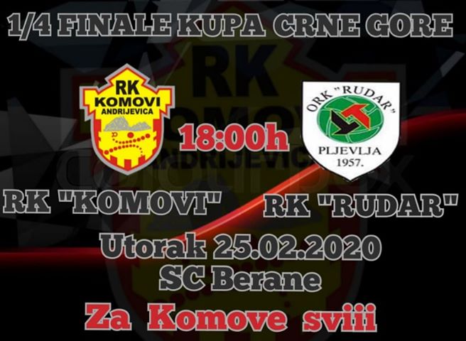 Rukometaši Komova, u četvrtfinalu Kupa Crne Gore sastaju se sa ekipom pljevaljskog “Rudara”. Meč u beranskoj Hali sportova biće odigran sjutra, sa početkom u 18 časova.