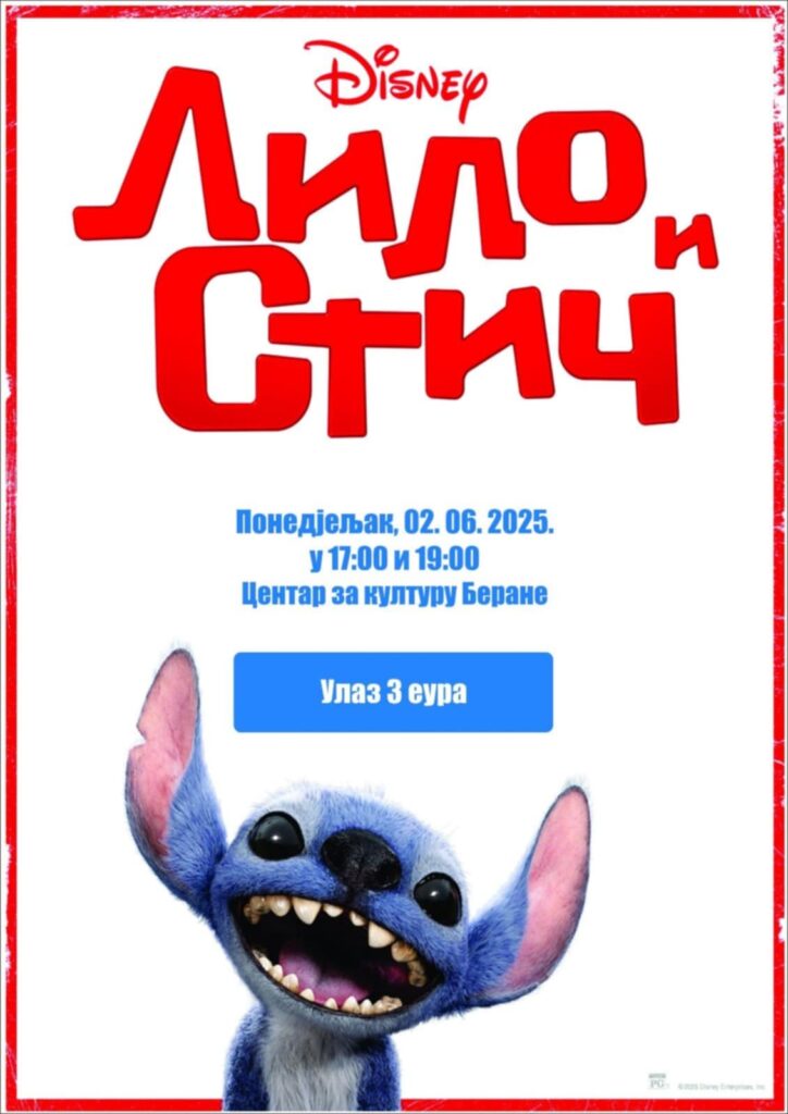 Animirani, sinhronizovani film „Lilo i Stič“ biće prikazan u bioskopu Centra za kulturu u ponedjeljak, 2. juna 2025. godine u 17 i 19 časova.