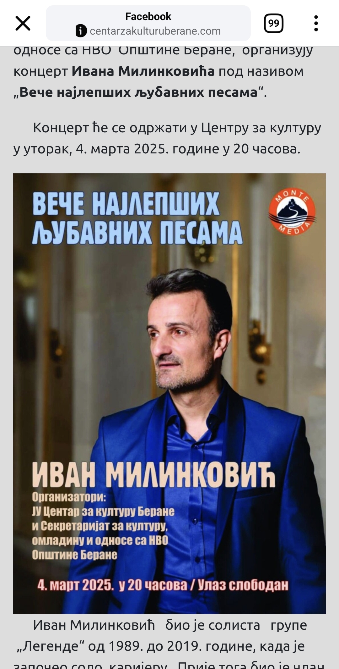 Povodom 8. marta, JU Centar za kulturu Berane i Sekretarijat za kulturu, omladinu i odnose sa NVO Opštine Berane, organizuju koncert Ivana Milinkovića pod nazivom „Veče najlepših ljubavnih pesama“.