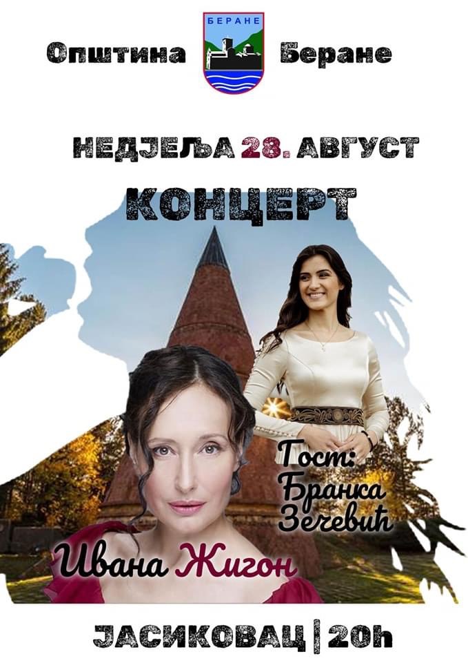 Koncert prvakinje dramskog pozorišta iz Beograda, slavne glumice Ivane Žigon biće održan u nedjelju, 28. avgusta, u amfiteatru spomen kompleksa Jasikovac u Beranama, sa početkom u 20 časova.