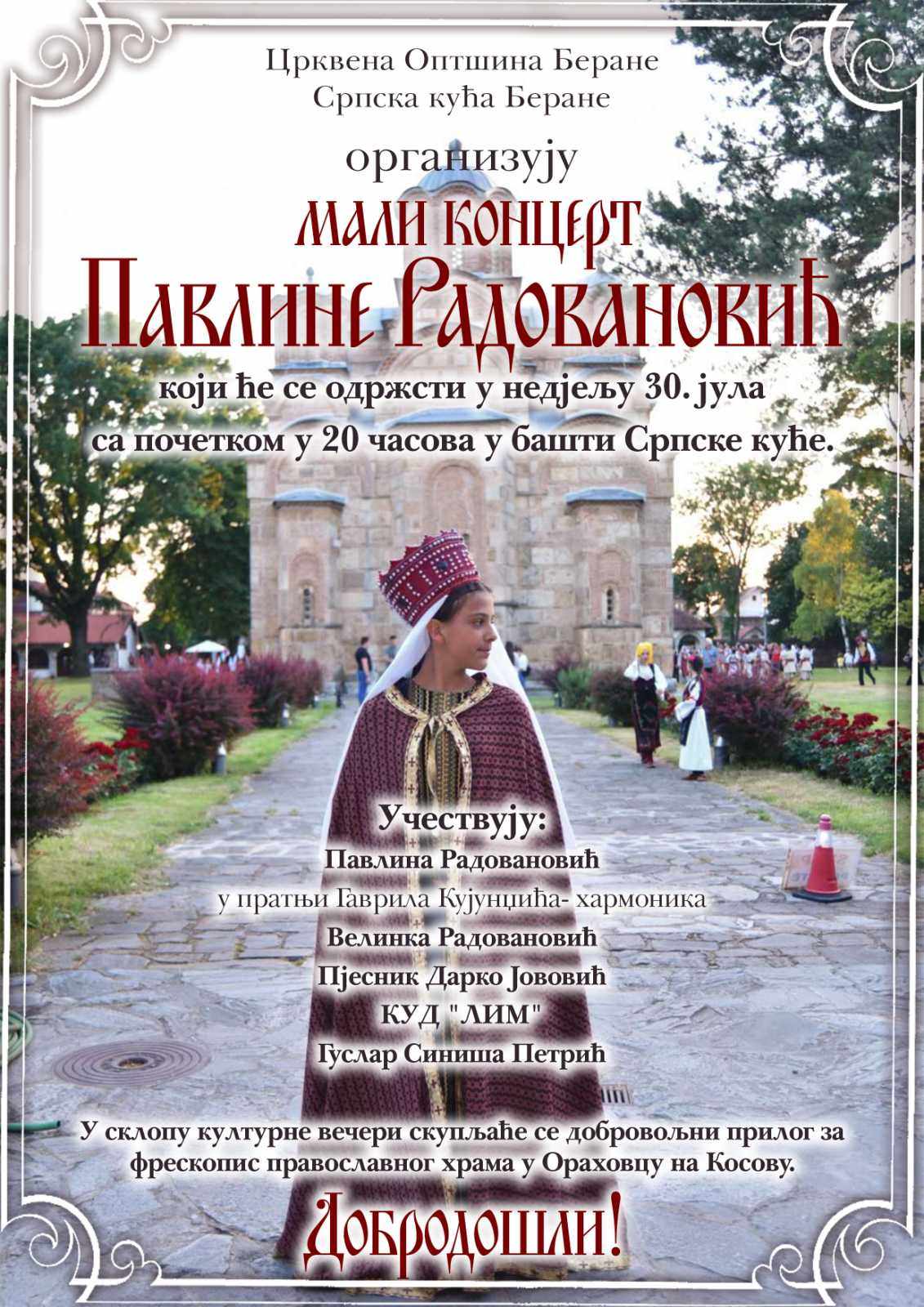 U bašti Srpske kuće u Beranama, u nedjelju, 30. jula, sa početkom u 20 časova, biće održan mali koncert Pavline Radovanović.