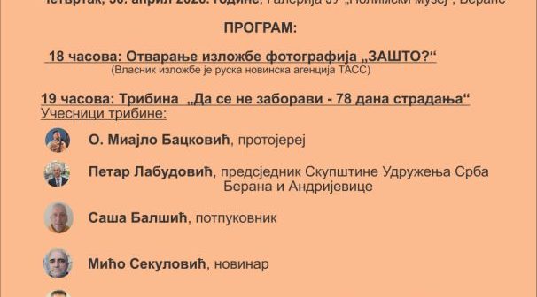 Nakon toga, u 19 časova biće održana tribina pod nazivom „Da se ne zaboravi – 78 dana stradanja“, na kojoj će učestvovati protojerej Mijailo Backović, Petar Labudović, predsjednik Skupštine Udruženja Srba Berana i Andrijevice, potpukovnik Saša Balšić i novinar Mićo Sekulić.