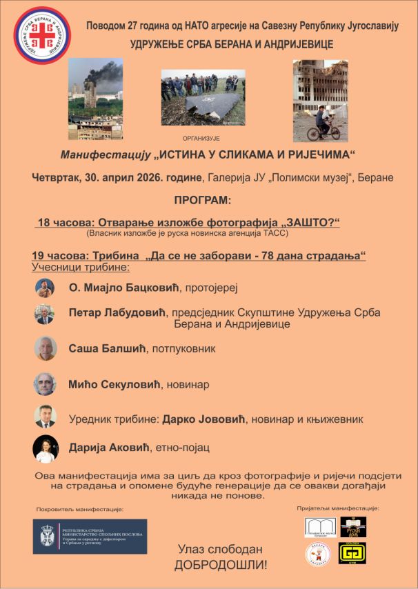 Udruženje Srba Berana i Andrijevice organizuje manifestaciju povodom 27 godina od NATO agresije na Saveznu Republiku Jugoslaviju, pod nazivom „Istina u slikama i riječima“, koja će biti održana u četvrtak, 30. aprila 2026. godine, u galeriji JU „Polimski muzej“ u Beranama.