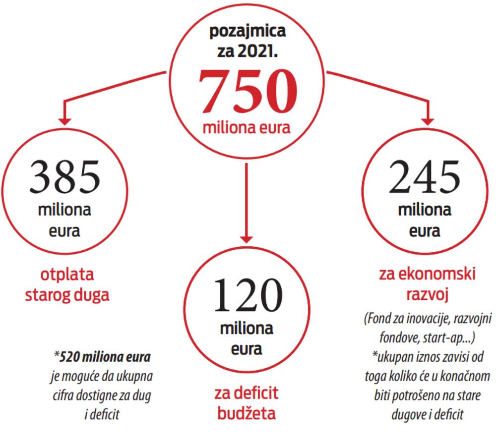 Većina novca ide na stare dugove bivše vlasti (u martu već pristiže 227 miliona), te deficit budžeta, a ostatak na razvoj ekonomije, koja će da padne u 2020. oko 15 odsto.