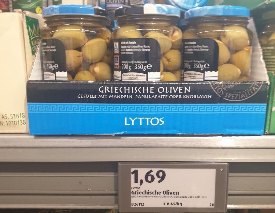 Masline u velikoj tegli u Njemačkoj se mogu kupiti za 1,69 eura, dok ih je kod nas teško naći za manje od tri eura. Jeftiniji su i krastavci u velikoj tegli, i cijena im je 1,29 eura.