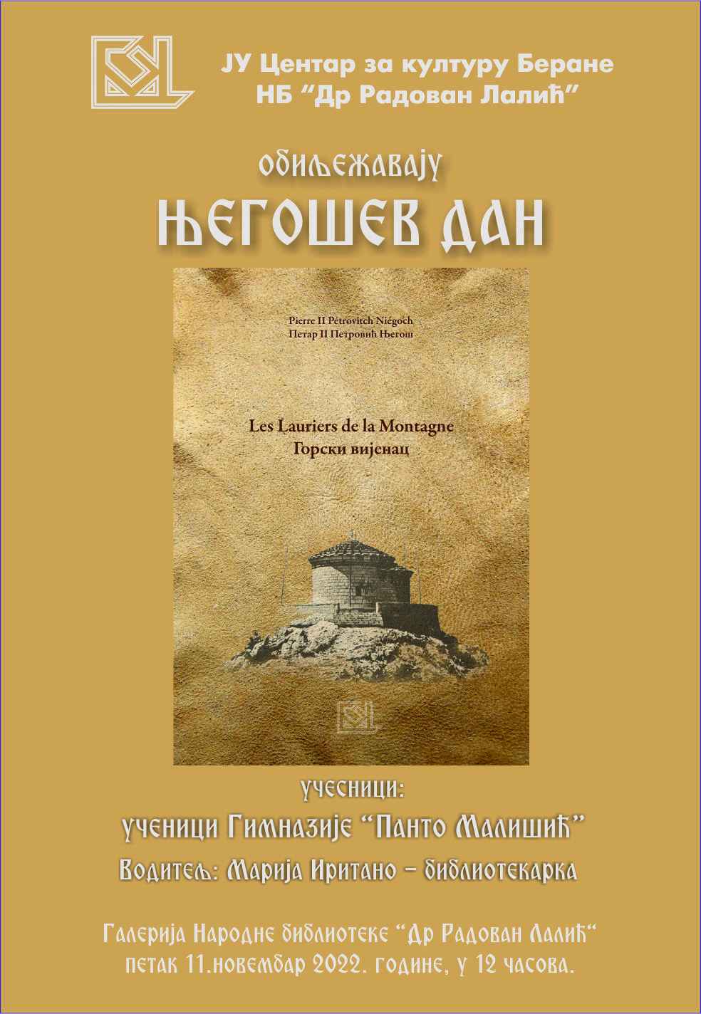 Povodom obilježavanja Njegoševog dana – crnogorskog praznika kulture, Centar za kulturu Berane i Narodna biblioteka „Dr Radovan Lalić“ organizuju književno druženje sa učenicima Gimnazije „Panto Mališić“, u petak, 11. novembra, sa početkom u 12 časova, u galeriji biblioteke.