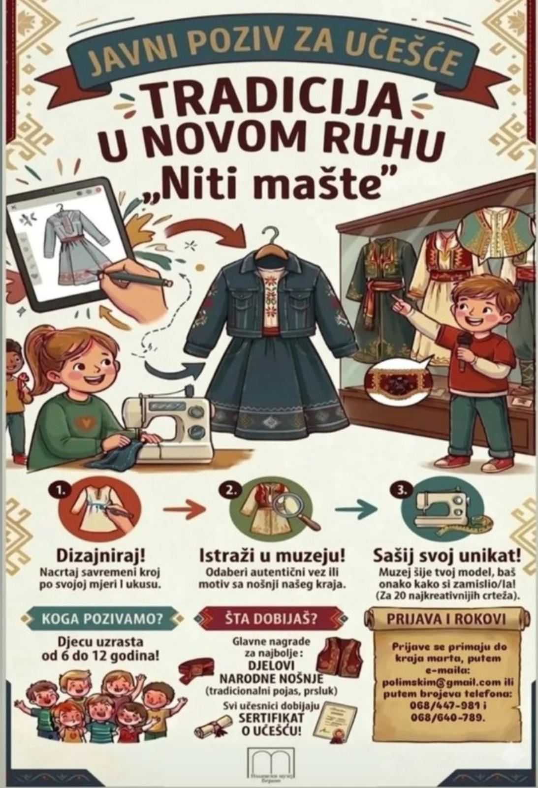 JU Polimski muzej, poziva male kreativce uzrasta od 6 do 12 godina, da se oprobaju u ulozi modnih dizajnera, kroz jedinstvenu interaktivnu modnu reviju koja spaja bogatu etnografsku zbirku našeg kraja sa dječijom kreativnošću.