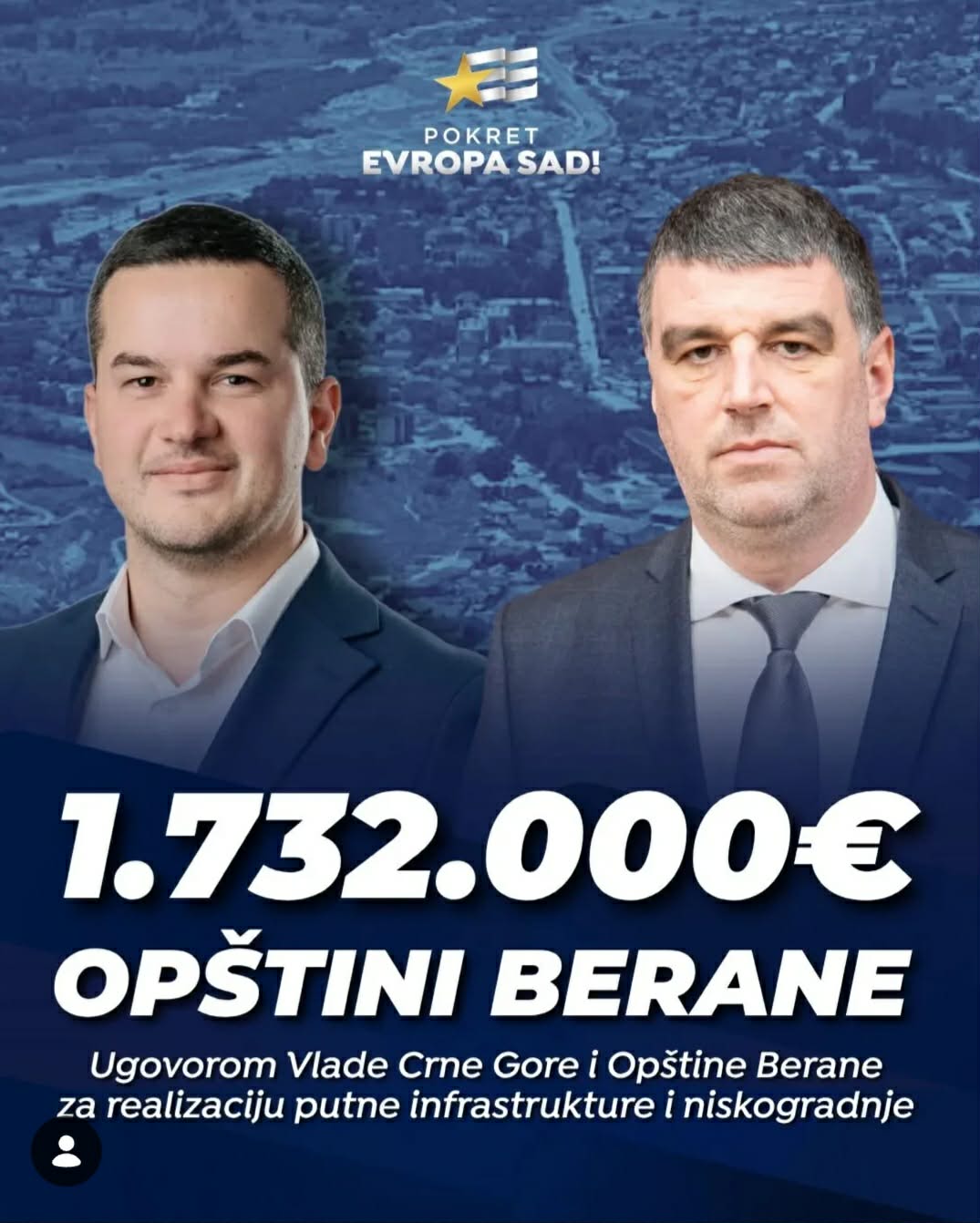 Pokret Evropa Sad Berane i predsjednik Opštine iz te partije, Đole Lutovac, objavili su na Instagramu da je našoj opštini opredijeljeno 1,7 miliona eura za modernizaciju infrastrukture.
