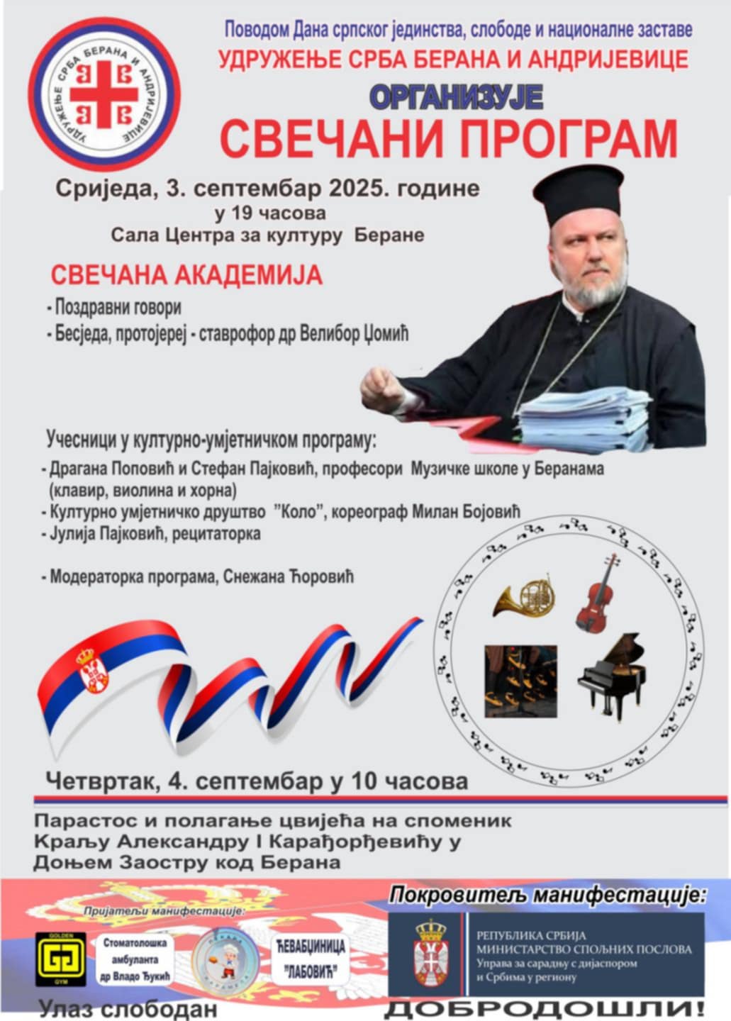Поводом Дана српског јединства, слободе и националне заставе Удружење Срба Берана и Андријевице организује свечани програм.