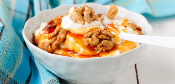 Red jogurta, pa red mrvica karamelizovanih oraha. Na vrhu neka bude jogurt. Staviti na svaki po jednu polovinu oraha i po jednu kašiku meda.