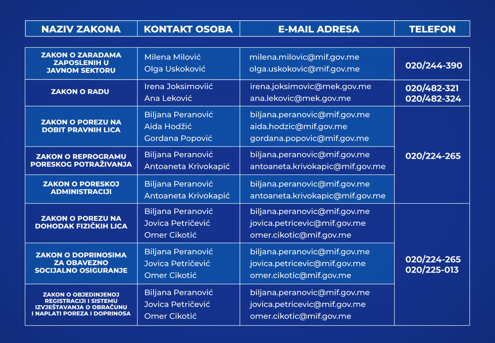 Ministarstvo finansija i socijalnog staranja (MFSS) objavilo je spisak kontakt osoba kojima građani mogu da se obrate za sve upite vezane za zakonska rješenja u okviru programa “Evropa sad”.