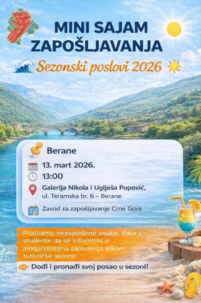 Zavod za zapošljavanje Crne Gore organizuje Mini sajam zapošljavanja – „Sezonski poslovi 2026“, koji će biti održan 13. marta 2026. godine sa početkom u 13 časova u Galeriji „Nikola i Uglješa Popović“, u ulici Teramska br. 6 u Beranama.