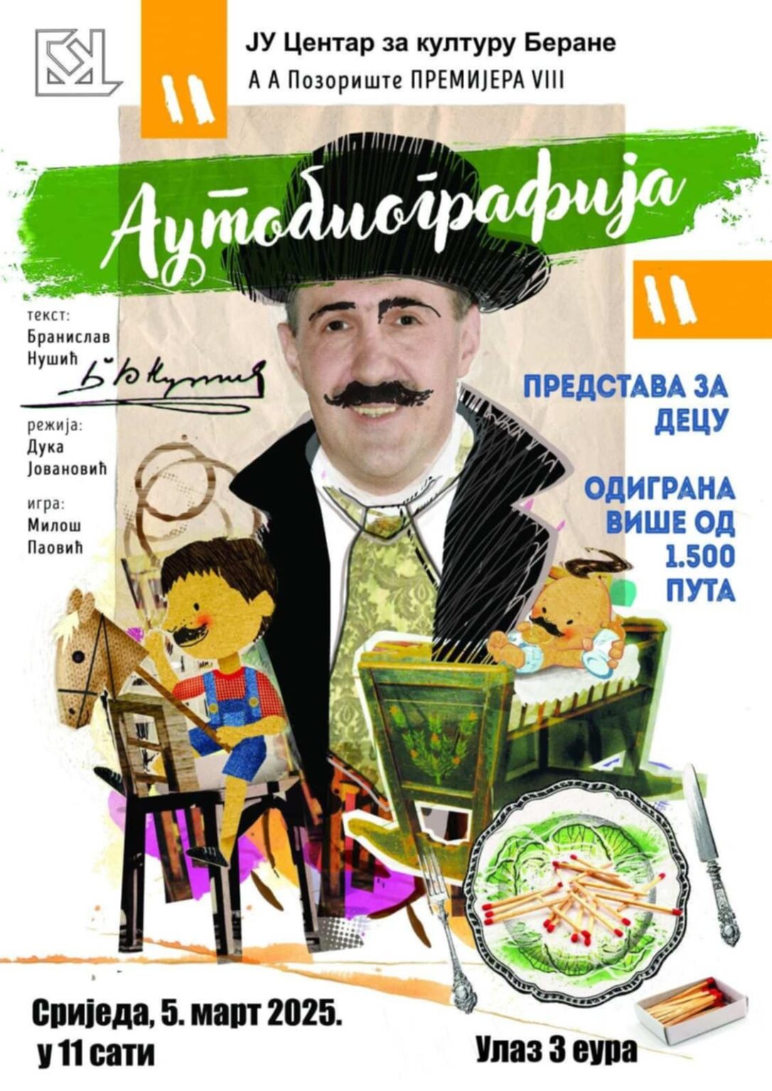 Позоришна монодрама за дјецу „Аутобиографија“ по тексту Бранислава Нушића, биће изведена на сцени Центра за културу у Беранама, у сриједу, 5. марта, у 11 часова. Режију потписује Дука Јовановић, а игра глумац Милош Паовић.