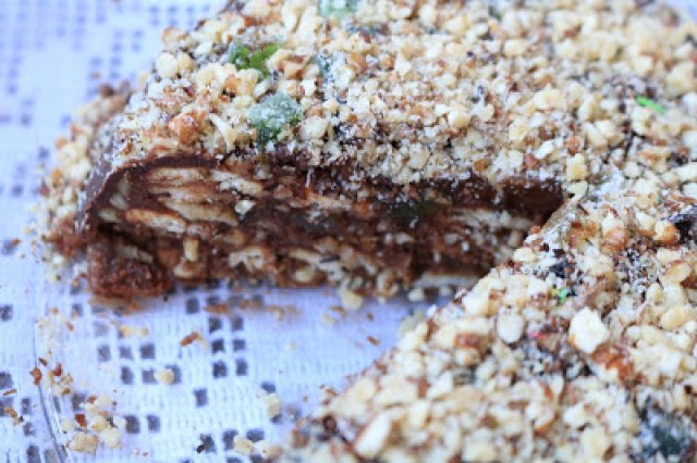 Ostaviti 2-3 sata u frižideru da se stegne. Preliti čokoladom i odozgo posuti sjeckanim bombonama i orasima.