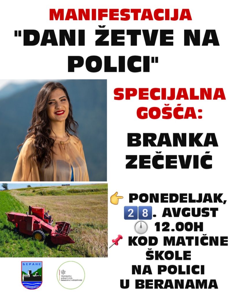 U ponedjeljak, 28. avgusta, Opština Berane, odnosno Sekretarijat za poljoprivredu, turizam i vodoprivredu, Sekretarijat za kulturu, omladinu i odnose sa NVO, Turistička organizacija Berane i mjesna zajednica Polica organizuju manifestaciju “Dani žetve na Polici” uz pomoć Ministarstva poljoprivrede.
